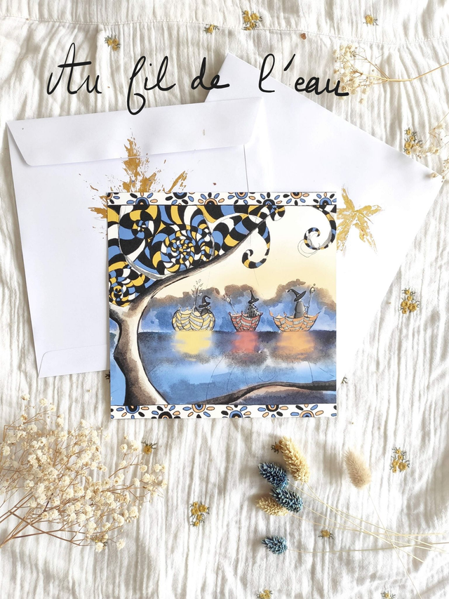 Cette carte (ou affiche) "Au fil de l'eau" se laisse emporter dans un coucher de soleil sur un fleuve imaginaire.