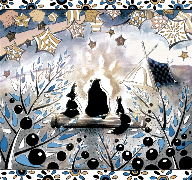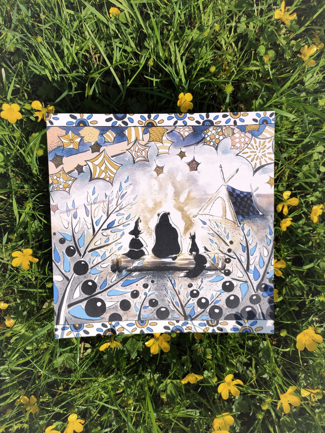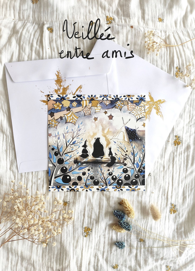 Cette carte (ou affiche) "Veillée entre amis" offre une pause bien méritée au coin du feu, quand étoiles et feuillage se confondent dans la nuit.