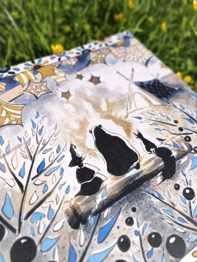 Illustration réalisée à l’encre noir ; mise en couleur digitale ; imprimée en couleur sur du papier épais 300g/m², avec une finition mat.