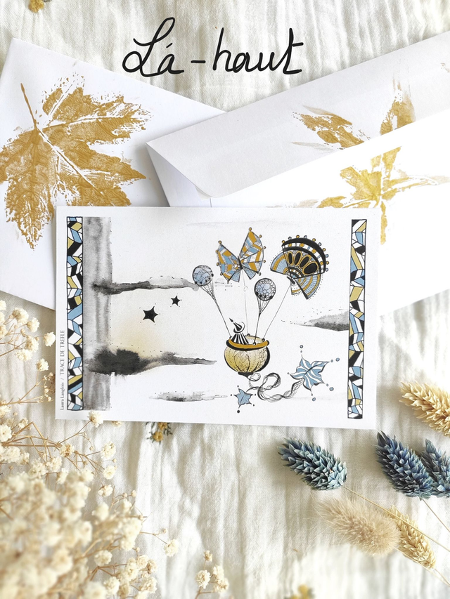 Illustration réalisée à l’encre noir ; mise en couleur digitale ; imprimée en couleur sur du papier épais 300g/m², avec une finition mat.